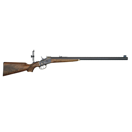 Pedersoli products feature high-quality wood-to-metal fit and finish. The manufacturer strives to recreate products that have authentic features and superior quality. Davide Pedersoli products are famous all over the world for quality working reliability and ballistic precision. – Features: 34 blue octagonal barrel case hardened frame with 1×18 twist 6 grooves walnut checkered pistol grips and double-set trigger. The forend has an inlet German silver cap. – Barrel Length: 34 Inch Octagonal – Caliber: .45-70 – Capacity: 1 – Weight: 12.55 lbs – Grip/Stock: Walnut Checkered Pistol Grip – Sights: Includes Long Range Creedmore (#USA430) and tunnel sight (#USA469-R) – Overall Length: 50.88 InchesDavide Pedersoli .45-70 Rolling Block Rifle