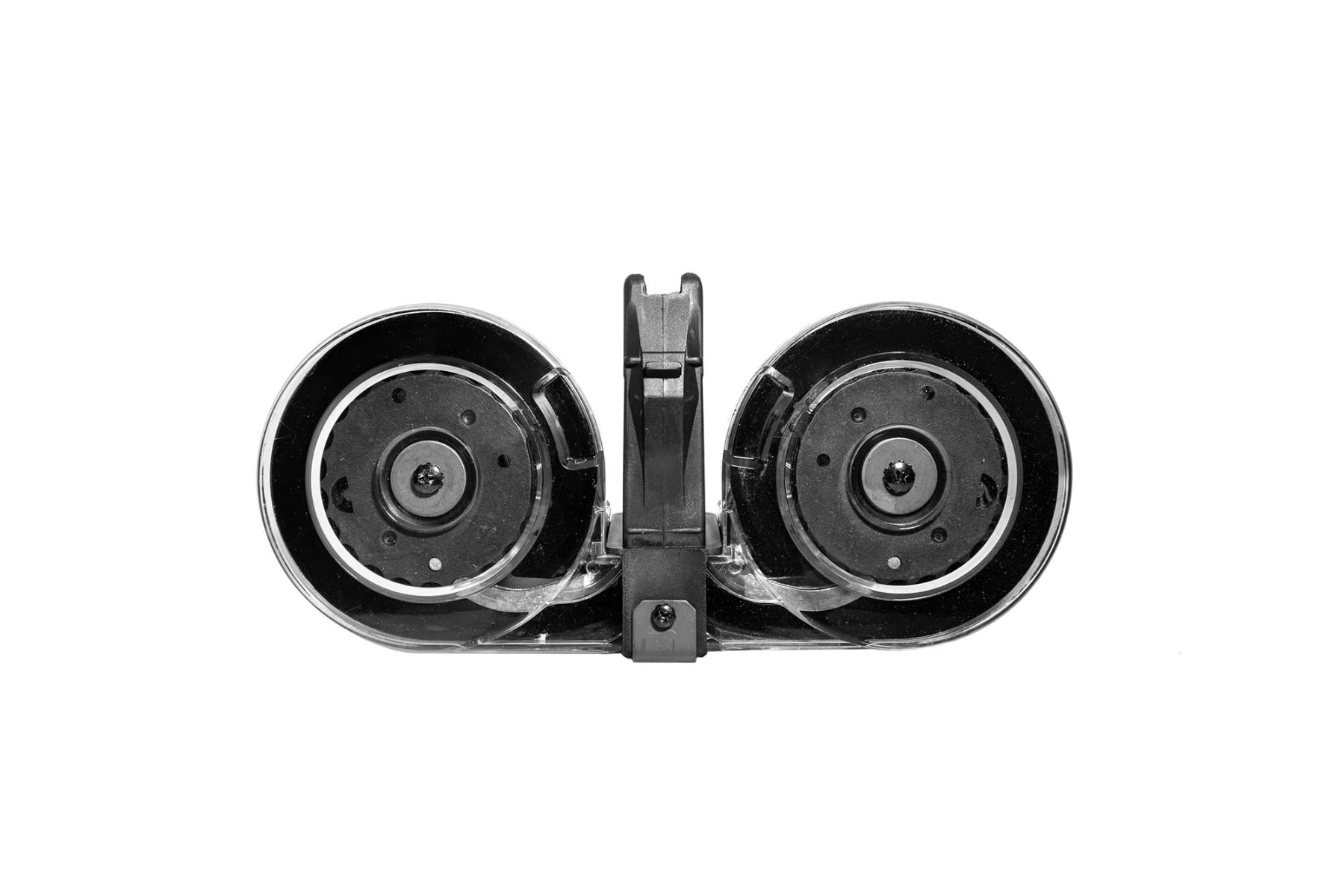 The dual-drum design has an alternating feed system that draws one round from one drum, then the next round from the other drum. This gives you a fixed center of gravity during the sustained fire to keep the AK74 stable. High-tensile compression springs allow you to leave the dual drum loaded for storage with no tension on the spring. The magazine has a metal follower that acts like ball bearings. Graphite lube is included to prevent misfeeds and jamming. 95-round AK-74 magazine comes with:Polymer speed loaderNylon carrying pouchGraphite lubricant tube for the follower Technical Specifications Weight 2.3lbs Color Black/Clear Compatible with AK-74 Caliber 5.45x39mm Capacity 95 rounds Body Material Polycarbonate Spring Material Leaf springKCI KCIMZ029 AK-74 95-Round Drum Magazine 5.45×39 Steel Black