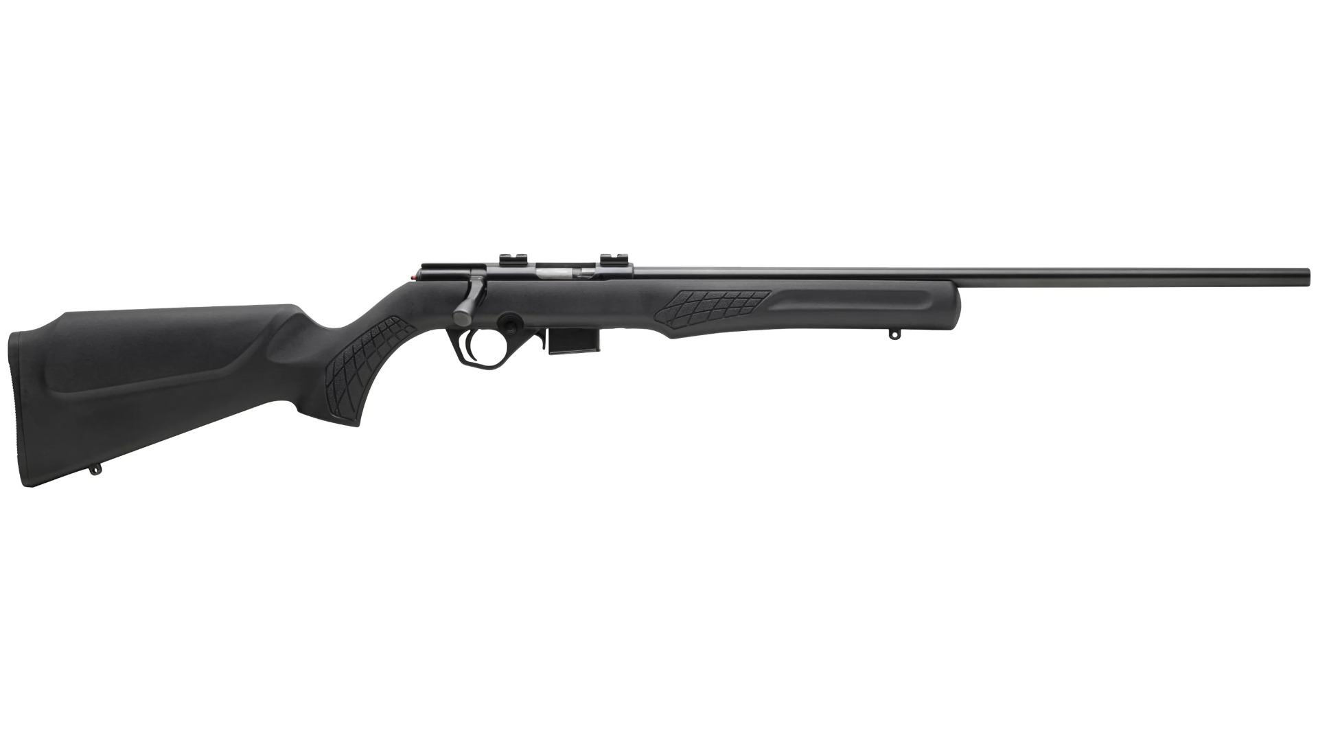 The Rossi RB17 is a reliable bolt action rifle chambered in .17 Hornady Magnum Rimfire, designed for both new and experienced shooters. With a 21″ barrel and a lightweight synthetic stock, this rifle is ideal for varmint control and recreational shooting. It features Weaver style scope mounts for easy optics attachment and a matte black finish for durability.